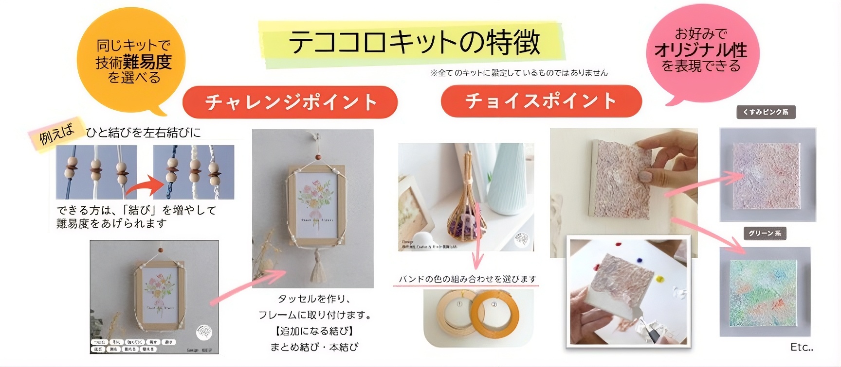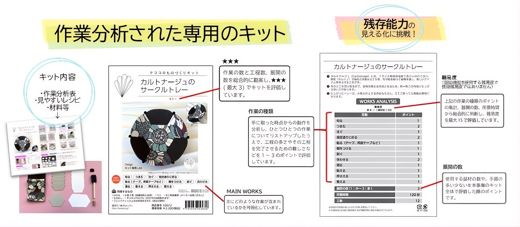| A | いいえ。どなたにでも楽しんでいただけるキットです。 ものづくりが好きな方はもちろん、認知機能の低下した方、はじめてものづくりをされる方にも楽しんでいただけるように、作業療法士の監修とハンドメイド作家の方々との教材開発ノウハウを凝縮して開発されたキットです。 |